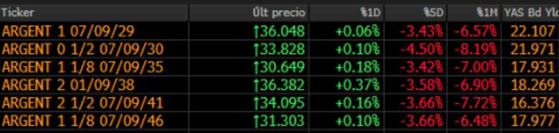 El alza más importante fue del GD38 (ganó 0,37%), mientras que el GD30 apenas subió 0,1% y su tasa interna de retorno está en 22 por ciento.