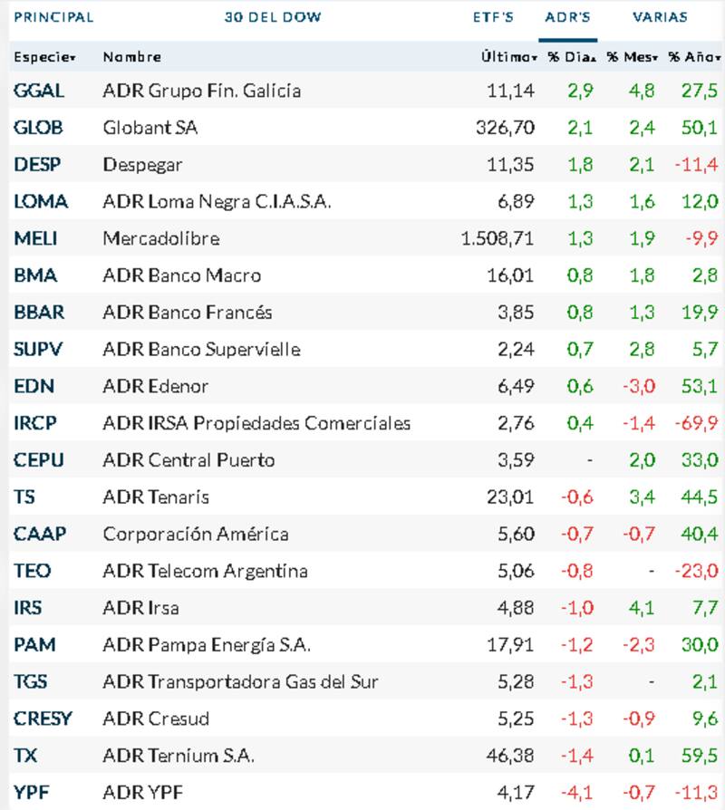 Los papeles de empresas argentinas que operan en Wall Street cerraron con suerte divergente. El papel de Banco Galicia cerró con un alza de 2,86%, liderando las subas, mientras que el de YPF cerró con una baja contundente de 4,14 por ciento.
