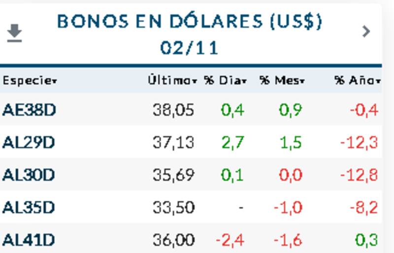 En cuanto a los bonos ley nacinoal, el AL29D saltó 2,7% en ByMA, mientras que el AL41D se hundió 2,4 por ciento. En tanto, el AL30D avanzó 0,1 por ciento.
