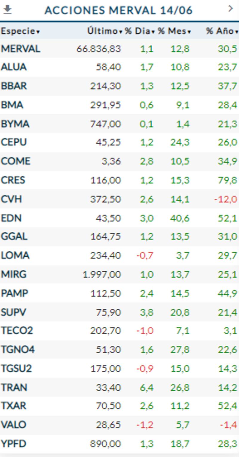 Entre las pocas bajas que se vieron figuran Banco de Valores (1,2%), Telecom (1%), Transportadora Gas del Sur (0,9%) y Loma Negra (0,7%).