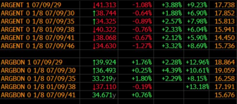 Respecto de los bonos, la curva de Globales mostró retrocesos generalizados. El principal fue el del GD29, que cerró 1,08% abajo, mientras que el GD30 cayó 0,64 por ciento.