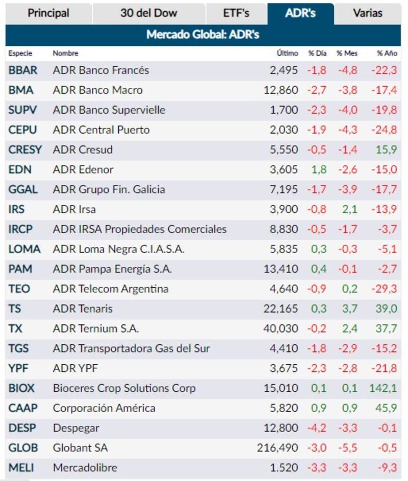En este escenario, los ADR también muestran debilidades lideradas por las acciones de Despegar, que caen 4,2%. Detrás, con rojos respectivos de 3,3% y 3%, los seguían MercadoLibre y Globant.