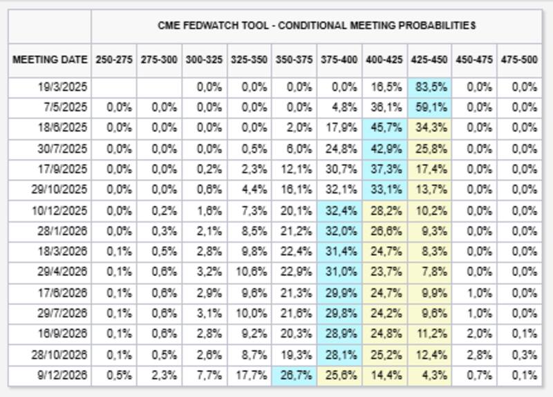 Los inversores asignan un 83% de probabilidad de que la Fed dejará sin cambios la tasa de interés en la reunión de marzo, así como también en la de mayo, en la que ve un 60% de chances de que ello ocurra.