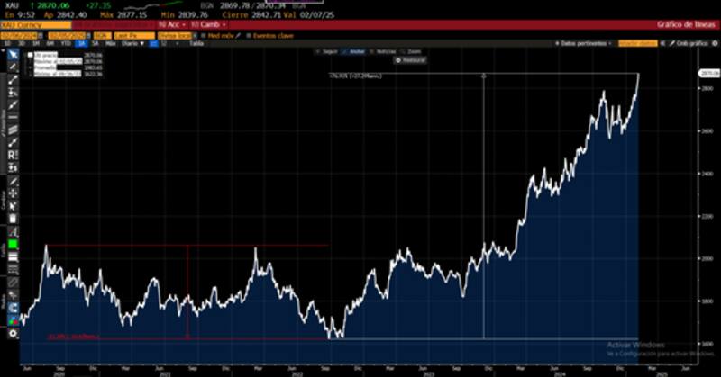 El oro pasó de u$s 1620 la onza, hasta los actuales u$s 2870, mostrando una ganancia de 77% en dicho periodo.