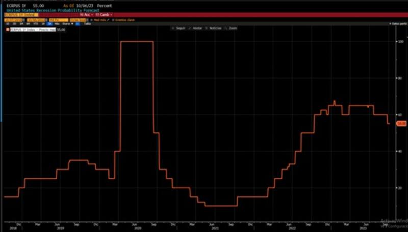 Actualmente, la probabilidad de una recesión en EEUU calculada por Bloomberg para los próximos 12 meses es del 55%.