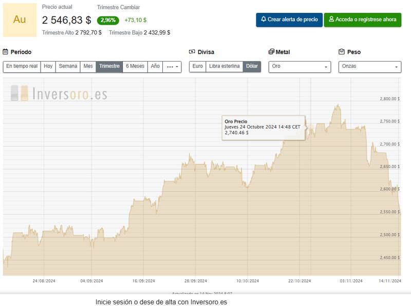 El 30 de octubre la cotización de la onza llegó al récord histórico de u$s 2792,71 la onza y perdió más de u$s 250 hasta hoy, que cotizaba a u$s 2547 la onza.