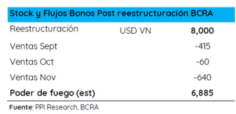 Según sus cálculos, el BCRA recibió luego de la Reestructuración de la deudacerca de u$s 8000 millones en bonos, de los cuales se desprendió u$s 415 millones en septiembre, u$s 60 millones en octubre y u$s 640 millones en noviembre. De esta manera, las ventas de bonos en noviembre fue la mas alta desde que se concretó el canje de deuda.
