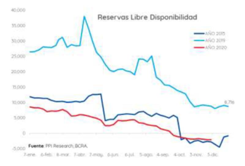 Los analistas de Portfolio Personal Inversiones (PPI) explicaron que lo que lo permitió la paz cambiaria reciente fue un fuerte uso de artillería pesada: "Entre fines de septiembre y el 27/11 (estimado), las reservas de libre disponibilidad pasaron de u$s -1083 millones a u$s -2.100 millones; es decir, se usaron unos u$s 1016 millones que fueron vendidos al sector privado, significando una absorción neta de $ 80.000 millones .