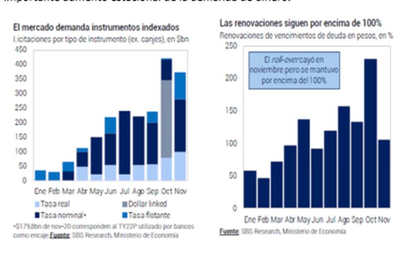 Desde Grupo SBS agregaron que las licitaciones de noviembre mostraron un roll-over mayor al 100%, como buscaba el gobierno. No obstante, la demanda estuvo sesgada hacia instrumentos CER y dollar-linked, revelando la preferencia de los inversores por alternativas indexadas en un contexto de elevadas expectativas de inflación y devaluación. Además señalaron que esto sugiere que profundizar el financiamiento con deuda en la recta final del año requeriría tasas de interés reales más elevadas, especialmente en un mes que muestra un importante aumento estacional de la demanda de dinero.
