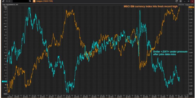 De la mano de la debilidad del dólar a nivel global, las monedas de mercados emergentes se han fortalecido de forma notable en el último año. De hecho, el índice de monedas de mercados emergentes alcanzó su mayor nivel en la historia, y acumula un avance del 12% desde el piso que alcanzó en marzo de 2020.