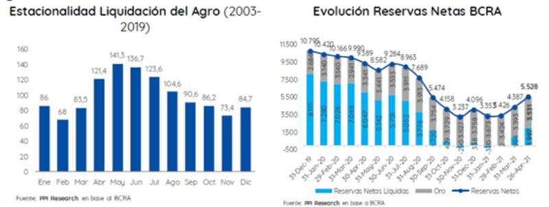Según datos de Portfolio Personal Inversiones (PPI), las reservas netas del BCRA se ubican en torno a los u$s 5528 millones y han mejorado desde el mínimo reciente de u$s 3353 millones. A su vez, la estacionalidad de la soja muestra que los meses de mayo y junio tienden a ser el pico de liquidación de la soja, para luego comenzar a descender.