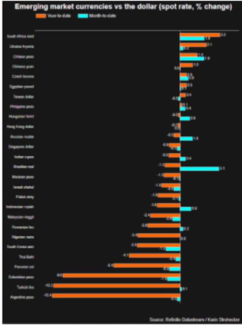 Entre ellas se encuentran el rand sudafricano, que se apreció un 3,2% en lo que va del año. También la grivna ucraniana (2,1% de apreciación en 2021), el peso chileno (1,4%), y el yuan chino (1%). La corna checa, la libra egipcia y el dólar en Taiwán también muestran una apreciación del 0,5% en promedio en el año.