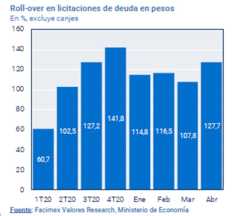 "El comienzo del año fue favorable ya que el primer bimestre cerró con un roll-over de 115,75% y elevada participación de instrumentos nominales y flotantes. No obstante, el roll-over cedió a la zona de 107,8% en marzo y se desplomó al 51% en la primera licitación de abril. Esto sembró dudas alrededor de la estrategia financiera del equipo económico, ya que un menor financiamiento con deuda llevaría a una mayor emisión monetaria incrementando las presiones inflacionarias y cambiarias", comentó.