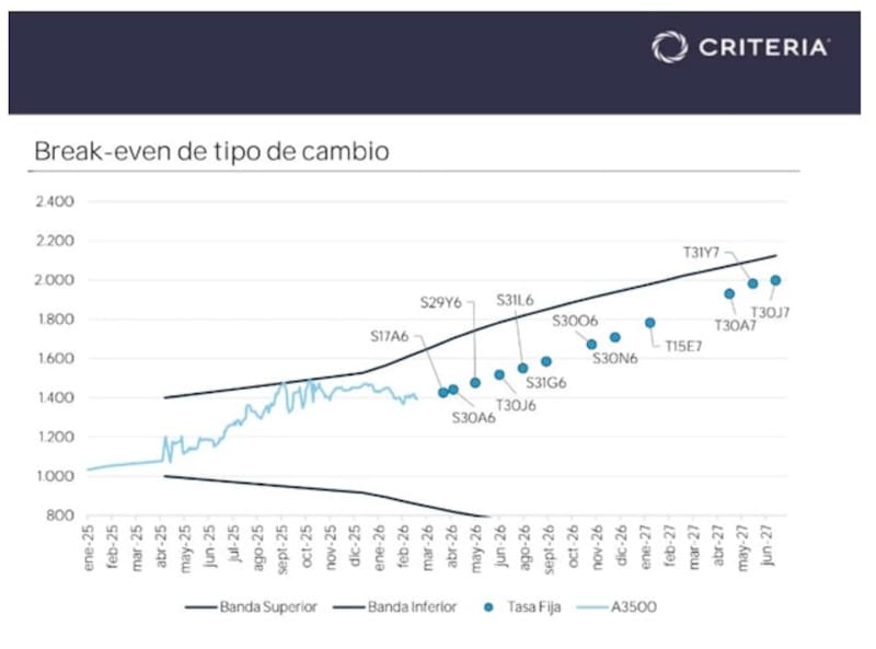 Además, la mayoría de los bonos a tasa fija muestran un dólar de indiferencia (break even) debajo de la banda, por lo que el inversor no solo debe especular con que el dólar no va a ir a buscar el techo, sino que debería esperar que se mantenga lejos de dicho limite.