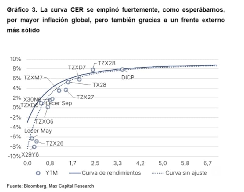Además, se observa que el tramo corto de la curva CER se encuentra rindiendo en negativo hasta julio, al tiempo que las tasas para la segunda mitad de 2026 y 2027 se encuentran en niveles de entre 3% y 5%, por debajo del 8% que rinde el TZX28.