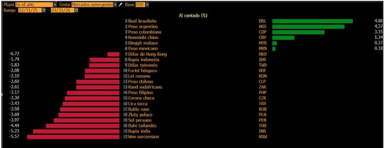 A su vez, el peso colombiano también se fortalece este año, con el tipo de cambio cayendo 3,1%, mientras que el peso mexicano se aprecia 0,2% este 2026.