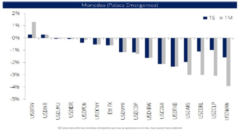 En lo que va del mes, el peso mexicano se aprecia 4%, junto con el peso chileno, el real brasilero y el peso argentino, que muestran una apreciación en el mes del más del 3%.