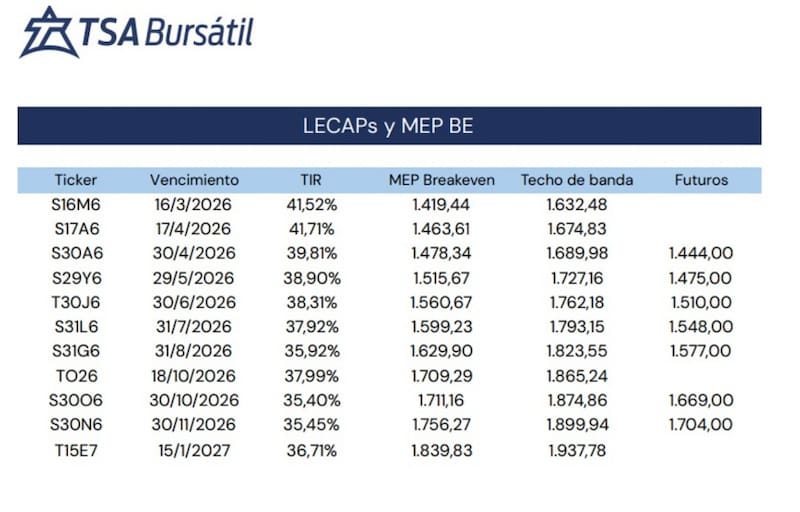 Según cálculos de TSA Bursáil, para la Lecap de mitad de marzo, el dólar break even es de $1419, es decir, un 1,7% por encima del valor actual del dólar y 13% debajo de la banda.