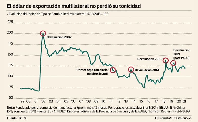 Más allá de que aún no sea momento de prender las luces rojas y que el TCRM aún conserva parte de la competitividad ganada con las devaluaciones de 2018 y 2019, algunas consultoras advierten que la menor depreciación del peso, combinada con una inflación que sigue caliente (3,6% en enero, 4% en febrero y posiblemente no baje de ese rango en marzo y abril), puede ser un combo riesgoso.