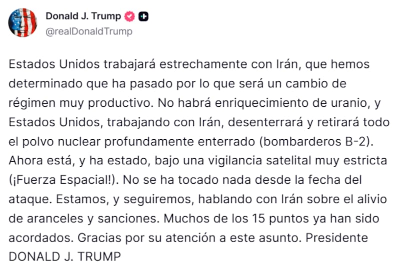 “No habrá enriquecimiento de Uranio y los Estados Unidos, trabajando junto a Irán, excavarán y retirarán todo el ‘Polvo’ Nuclear profundamente enterrado (de los Bombarderos B-2).”, explicó en Truth Social. Reveló que este material nuclear está activamente siendo vigilado de manera satelital y ninguna parte de este suministro fue tocado desde el comienzo de los ataques.