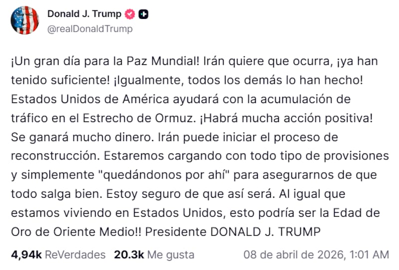 A pesar de sus declaraciones previas al vencimiento del ultimátum que amenazaban con destruir la civilización iraní, una vez negociado el cese de las hostilidades, Trump declaró que la república islámica está en condiciones de comenzar su proceso de reconstrucción.