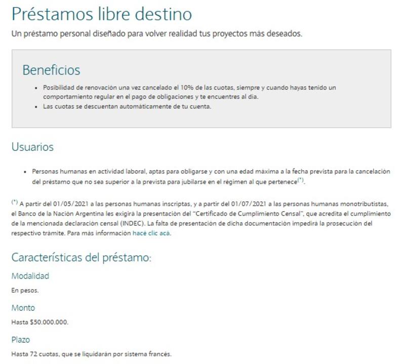 Aquellos clientes del Banco Nación que sean monotributistas y trabajadores en relación de dependencia pueden acceder un crédito de hasta $ 50.000.000 con la posibilidad de pagar en 72 cuotas, liquidadas bajo el sistema de amortización francés.