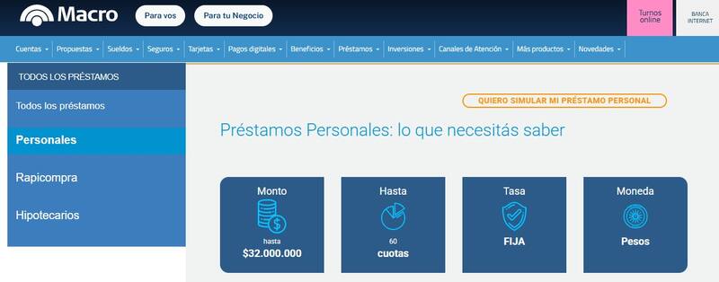 El Macro es otro de los bancos que ofrece préstamos similares. Su oferta consiste en un crédito a pagar en un plazo máximo de 60 meses para clientes que sean monotributistas y que acrediten sus haberes en el banco. Es posible pedir $ 25.000.000, ya que el tope máximo de otorgamiento es de hasta $ 32.000.000.