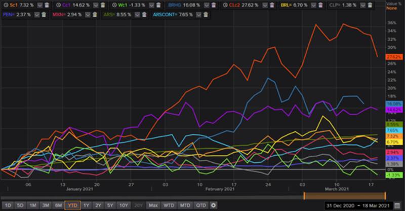 La soja y el maíz muestran subas respectivas de 7,3% y 14,6% en lo que va del año. El petróleo escala 27,6% mientras el cobre avanza 16% en 2021. Pero la dinámica alcista de las materias primeras durante los primeros 100 días del año no están generando una dinámica favorable en las monedas de la región ya que todas se devalúan durante el 2021.