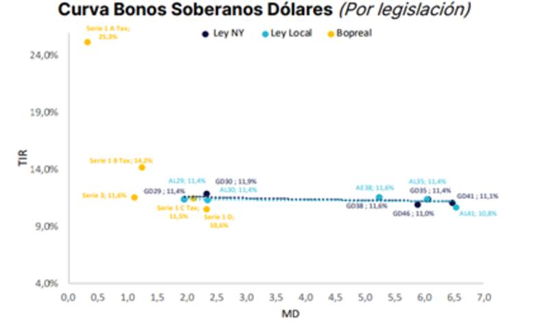 "Si bien la curva de rendimientos se aplanó y se muestra muy similar entre Bopreales, Bonares y Globales, por el momento consideramos como "arbitrables" solo a los Bopreales y los Bonares "cortos" (AL29 y AL30), por cuestiones de legislación, moneda de pago y duration", afirmó.