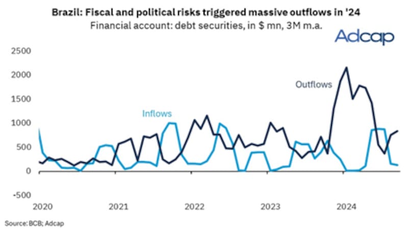"Durante el proceso de depreciación del real, las inversiones que buscaban beneficiarse por las elevadas tasas en Brasil (operaciones de "Carry Trade") perdieron. Esto llevó a una masiva salida de capitales en durante la mayor parte de 2024", detallaron desde Adcap Grupo Financiero.