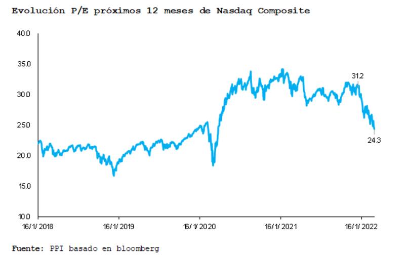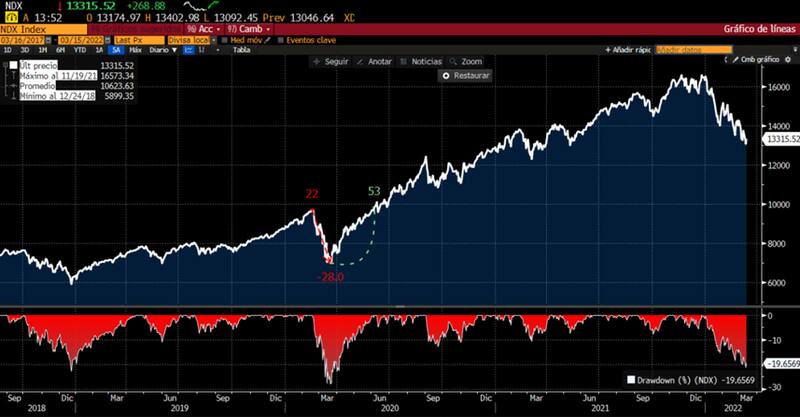 "El impacto fue superior en el Nasdaq caracterizado por contar con una mayor ponderación de acciones conocidas como ´de crecimiento´, que tienen una mayor sensibilidad (duration) a movimientos en la tasa de interés. Por lo tanto, el Nasdaq se hundió 22,4% desde su máximo, mientras que el S&P 500 y el Dow Jones cayeron 13,4% y 10,8% respectivamente", dijo.