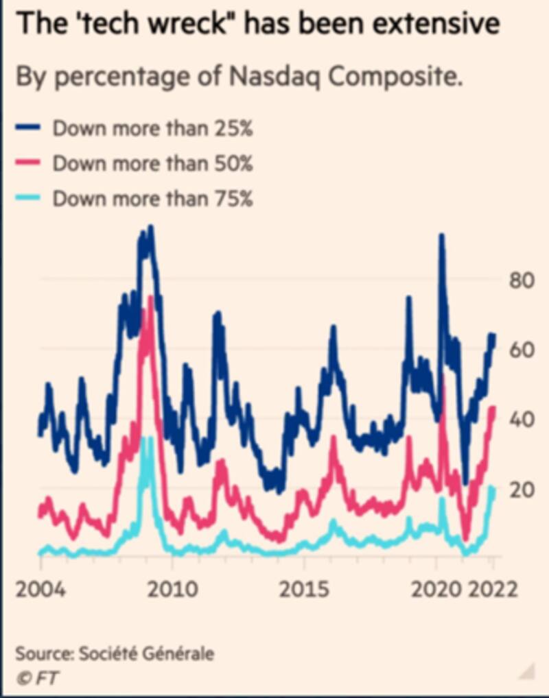 El hecho de que haya un 20% de las acciones del Nasdaq que acumulan una pérdida de más del 75% de su valor es un hecho solo comparable con lo registrado en el estallido de la crisis de las punto.com en los años 2000.