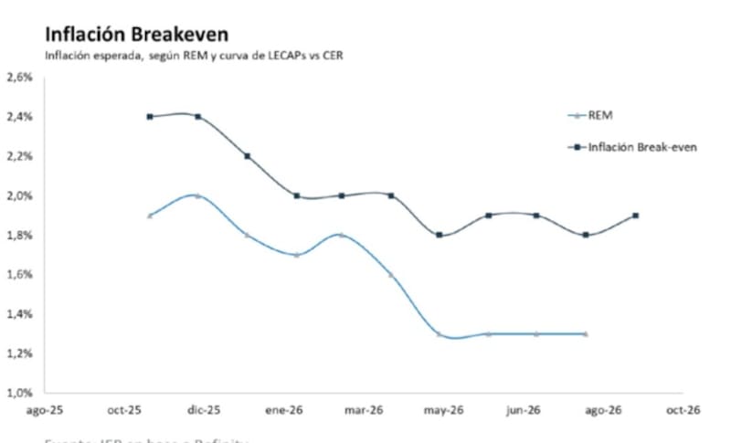 “La curva Lecap se mantiene plana, con rendimientos que oscilan entre el 2% mensual y el 2,4%. Las tasas de inflación de equilibrio actuales implican una tasa de inflación del 18,9% para 2026, muy por encima de nuestra proyección base del 11,4% para ese año”, detallaron.