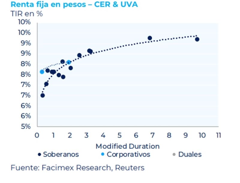 “En los CER, el TZX27 continúa ofreciendo alrededor del 8% real. Dentro de la curva dual, vemos valor particularmente el TTS26, que bajo supuestos conservadores de TAMAR converge a una TNA cercana al 40%. Ambos instrumentos permiten capturar carry con buena protección ante eventuales desvíos inflacionarios”, afirmaron.