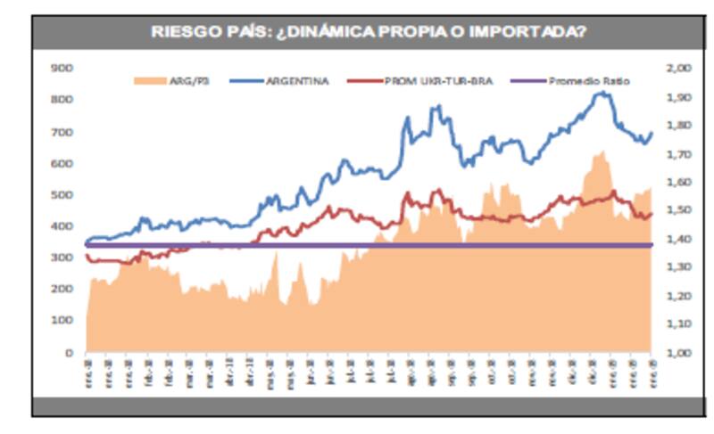 “El riesgo país argentino tuvo una dinámica mayor que sus comparables en este comienzo de año, aunque esa tendencia se revirtió en los últimos días y nuevamente el ratio entre el valor local y el promedio de los comparables se ubica cerca de los máximos , sostuvieron desde Quinquela.
