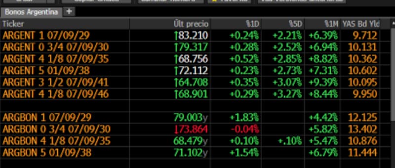 Todos los tramos de la curva soberana argentina abren al alza el lunes, empujando a la baja al riesgo país.