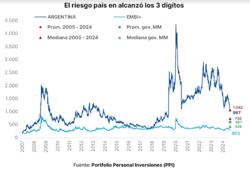 "Creemos que el Riesgo País seguirá comprimiendo en la recta final de año, sujeto a que el escenario global acompañe. El Riesgo País quebró hoy los 1000 puntos, fenómeno inédito para la historia reciente al considerar períodos con controles cambiarios", dijo Yarde Buller.