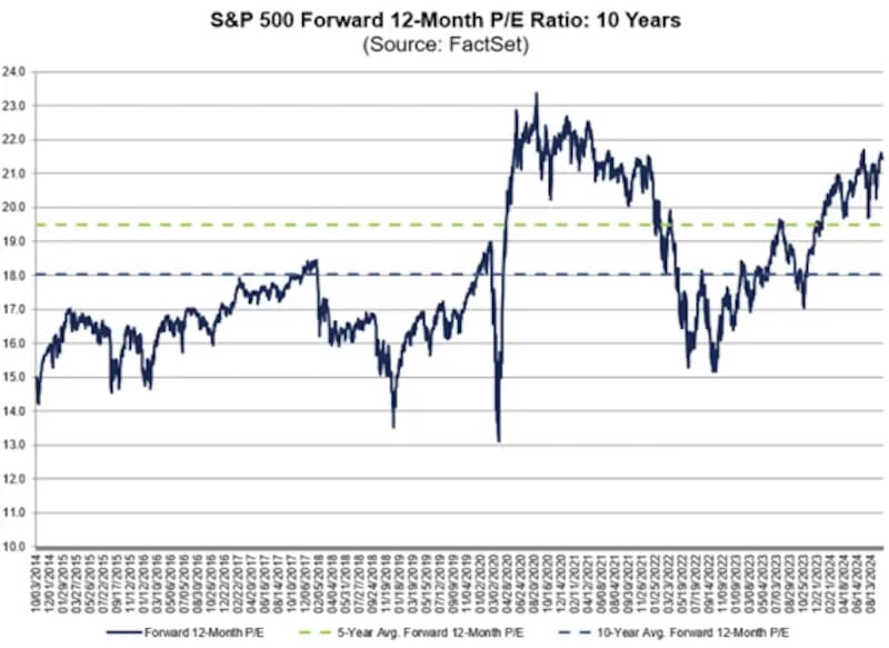 El ratio P/E forward a 12 meses del S&P 500 se ubica en 21 veces ganancia, cuando el promedio de 5 años es de 19,5 veces ganancia y el promedio a 10 años es de 18 veces ganancias.