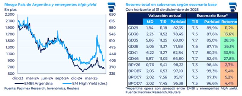 "En nuestro escenario base, los spreads de la deuda argentina estarán entre el EMBI (301pbs) y los emergentes high yield (414pbs) hacia fin de año, mucho más cerca de los corporativos Oil & Gas (excluyendo YPF), actualmente en 334pbs. Esto favorecería particularmente a bonos largos como GD41 y GD35, por su mayor duration y alta convexidad, dejando retornos totales entre 28,5% a 30,9% hasta fin de año. Los retornos serían aún mayores (39,5% a 43,6%) en un escenario más optimista donde Argentina pueda converger a la curva de Brasil como en 2016 y 2017", detalló Yarde Buller.