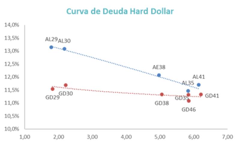 "Seguimos viendo el mayor valor en la deuda en dólares de aquí a un año vista en GD35, basados en nuestros ejercicios de retorno total. Dicho esto, seguimos pensando que, si se normaliza la curva de Globales y pasa a tener pendiente positiva, puede haber inversores que prefieran el tramo corto como en el Global 2029 y Global 2030", dijo Franco.