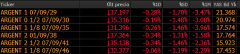 En el tramo medio, los bonos operan con caídas de 0,26% en el Global 2035 y de 0,34% en el Global 2038. Por su parte, en el tramo más largo, la deuda cae 0,34% en el Global 2041 y 0,06% en el Global 2046.