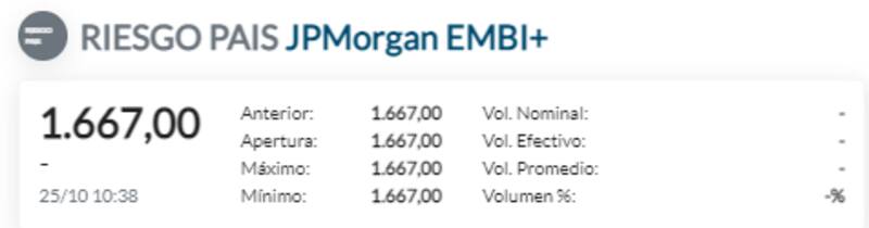 El riesgo país inicia la semana en 1667 puntos básicos, ubicándose a 13 unidades de sus máximos post canje de deuda, de 1680 puntos.