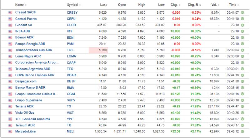 Las acciones, en cambio, inician la semana con mayoría de ganancias. Las subas son lideradas por MercadoLibre que sube 2,2%, seguida por Ternium, YPF y Vista Oil que ganan 1,8%, 1,57% y 1,4% respectivamente. Las acciones del sector financiero avanzan 0,5% en promedio.