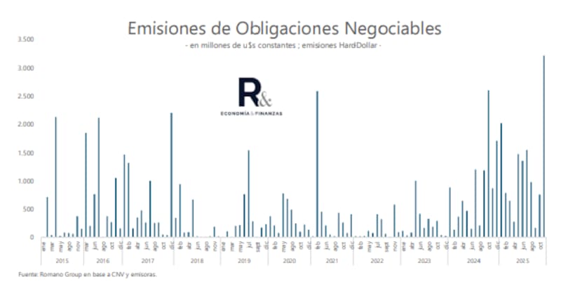 No obstante, Romano plantea un escenario favorable para la estrategia del Gobierno. La firma destaca la intensa emisión de deuda corporativa que se registró a lo largo de noviembre, un factor que reduce indirectamente la presión sobre el tipo de cambio, especialmente en las colocaciones de “new money” y no en simples refinanciaciones. Estas emisiones ya superan los u$s 3200 millones —récord en términos reales— y, si se incluye a la Ciudad de Buenos Aires, el total se acerca a los u$s 3800 millones.