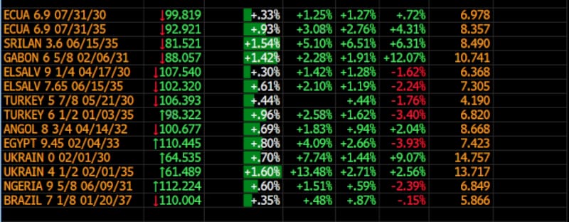 En comparación con la deuda emergente, el movimiento local fue más agresivo. Bonos de países como Ecuador, Egipto o Turquía también cerraron en positivo, pero con subas más moderadas en general.