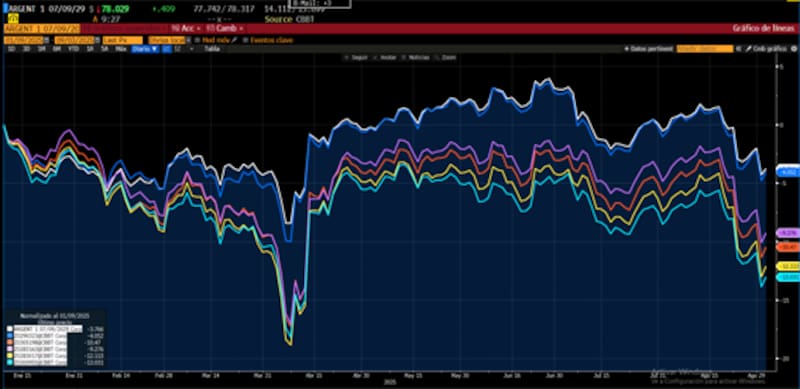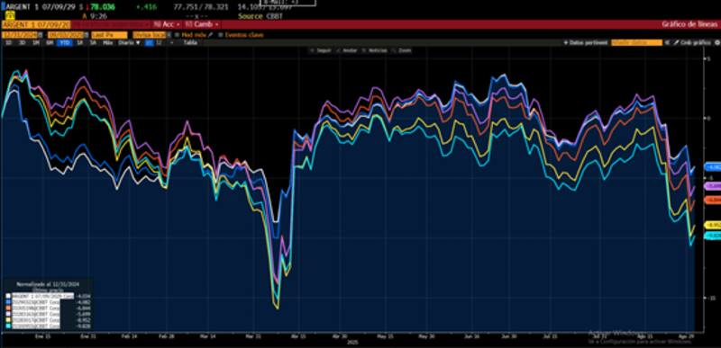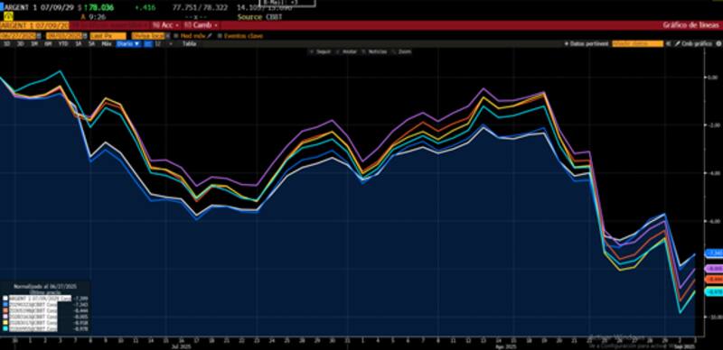 En el tramo medio, los Globales a 2035 y 2038 retroceden 6,8% y 5,7% respectivamente, mientras que en el extremo más largo de la curva, los títulos a 2041 y 2046 caen 8,9% y 9,8% en lo que va del año.