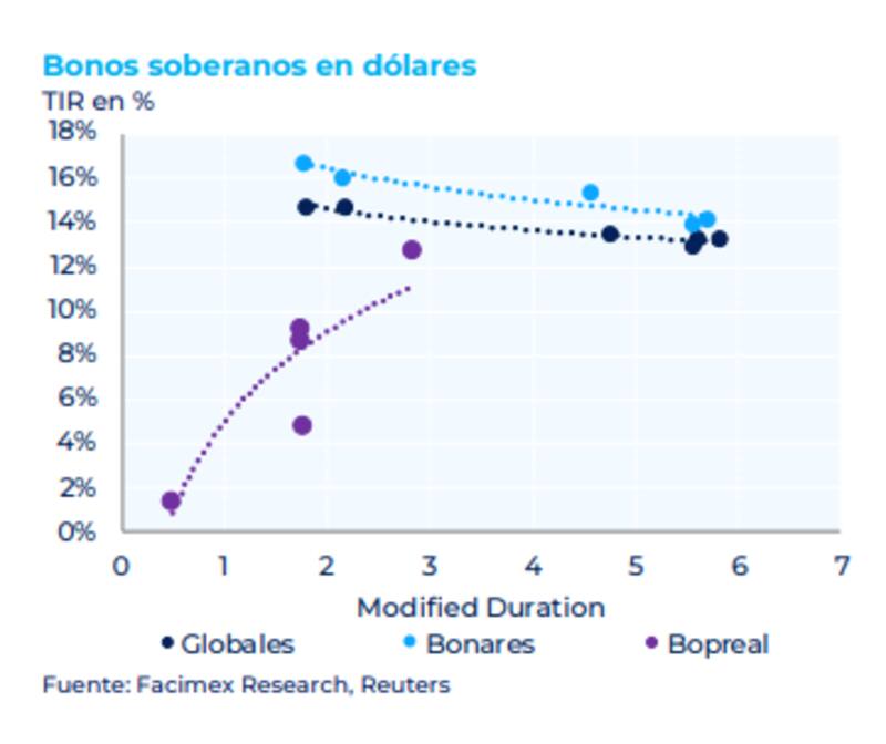 Los bonos cortos de ley local operan con tasas por encima del 16%, cayendo a niveles de 15% a 13% en los tramos medios y largos. Por su parte, los Globales rinden 14% en el tramo corto, cayendo a niveles de 12% a 13% en los tramos medios y largos.