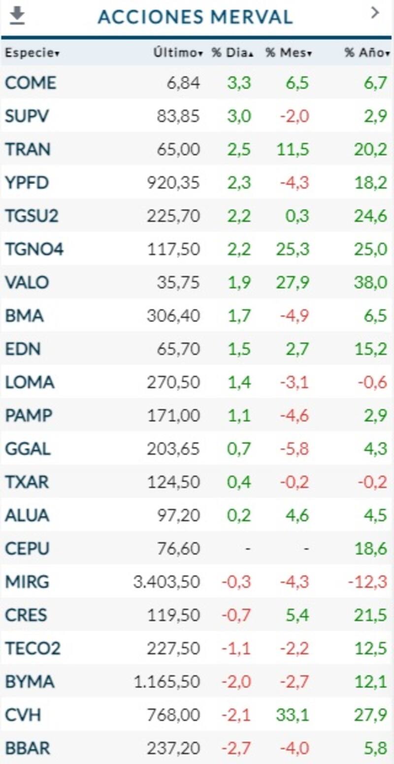 Del otro lado, entre las compañías que registran variaciones negativas, los papeles de Banco Francés lideraron las bajas, que registraron un descenso de 2,6%. A estos le siguieron las acciones de Cablevisión y Byma, que cerraron la jornada con caídas de 2,2% y 2,0% respectivamente.