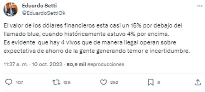 Setti señaló que "el valor de los dólares financieros está casi un 15% por debajo del llamado blue, cuando históricamente estuvo 4% por encima. Es evidente que hay 4 vivos que de manera ilegal operan sobre expectativa de ahorro de la gente, generando temor e incertidumbre", afirmó.