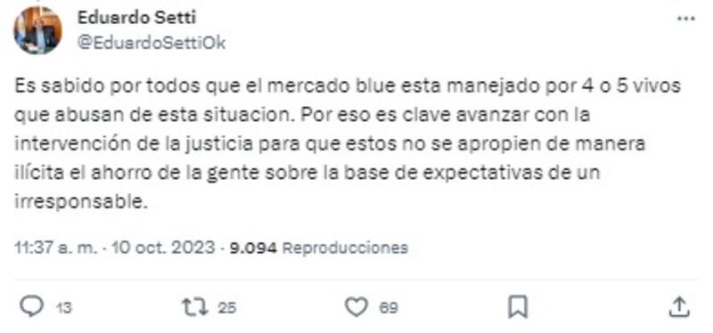"Es sabido por todos que el mercado blue esta manejado por 4 o 5 vivos que abusan de esta situación. Por eso es clave avanzar con la intervención de la Justicia para que estos no se apropien de manera ilícita el ahorro de la gente sobre la base de expectativas de un irresponsable", advirtió.